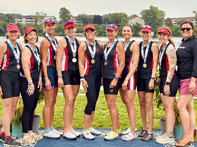 Masters row outdoors from spring through fall, typically April through early November, taking advantage of the full rowing season on the water. When colder weather arrives, training transitions indoors with erging (indoor rowing machines) at the Dammrich Rowing Center in Skokie, IL. This balance of seasonal training ensures athletes maintain endurance, strength, and technical sharpness year-round.